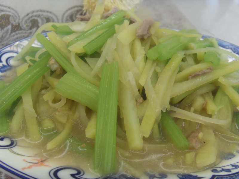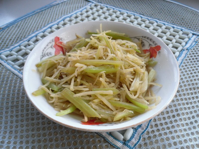 4:油热,放蒜、土豆丝、芹菜翻炒。