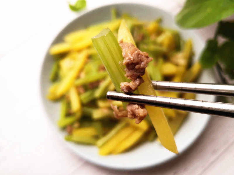 2:土豆切细丝,芹菜切断,肉切丝,蒜切沫。