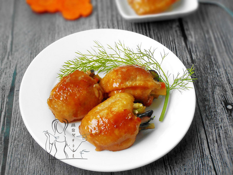 5:腌制好的鸡翅在内侧抹上淀粉,分别塞入山药条、胡萝卜、香菇、茴香梗;