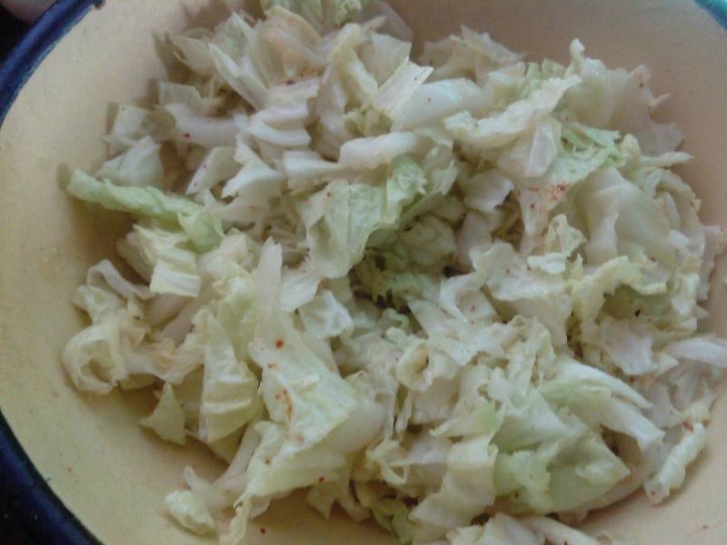 1:将白菜心切好,放入盐,香油,辣椒粉!