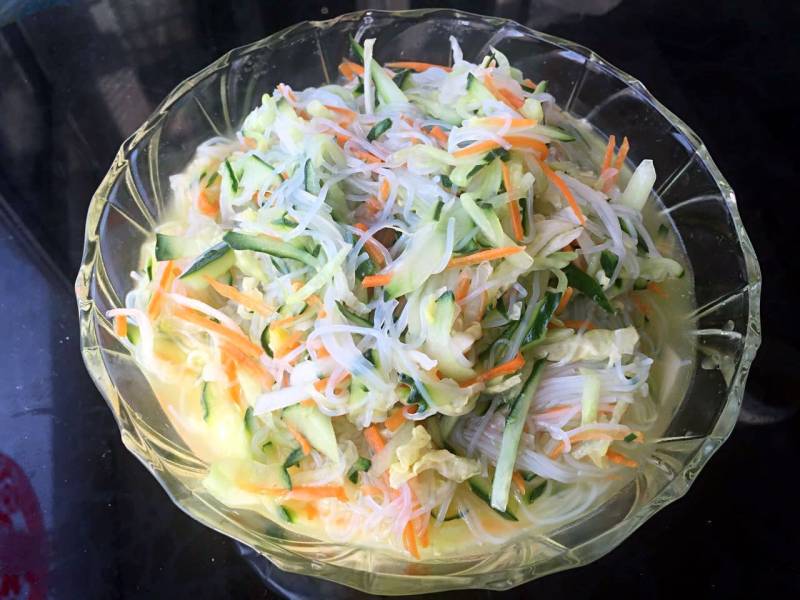 6:将黄瓜丝、胡萝卜丝、白菜丝和粉丝混合,加白醋、糖和盐,加几滴香油搅拌均匀,喜欢辣的可以加辣椒油,喜欢蒜的可以加蒜汁即可。