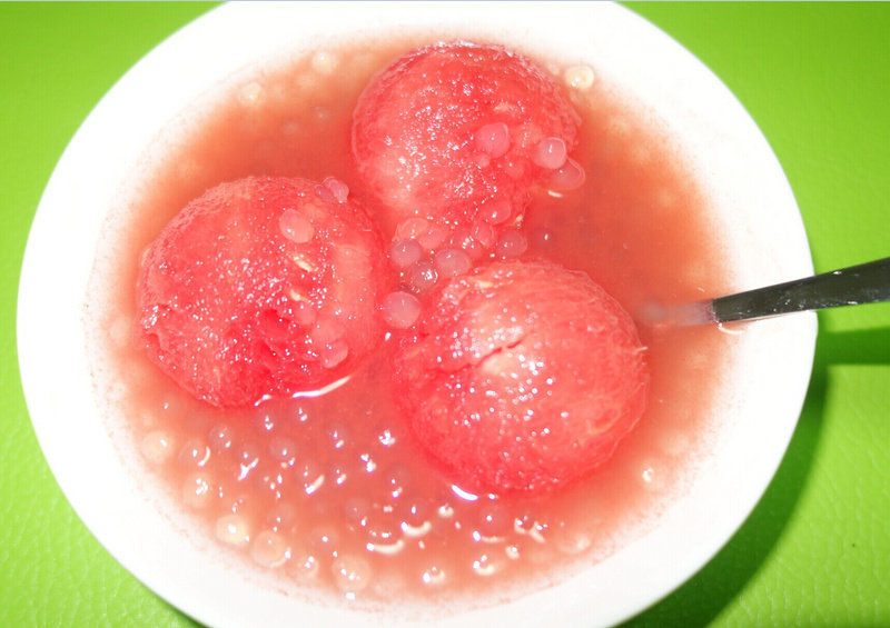 8:将西米倒入碗中,加入过滤好的西瓜汁搅拌均匀,放上西瓜球装饰,放入冰箱冷藏即可。