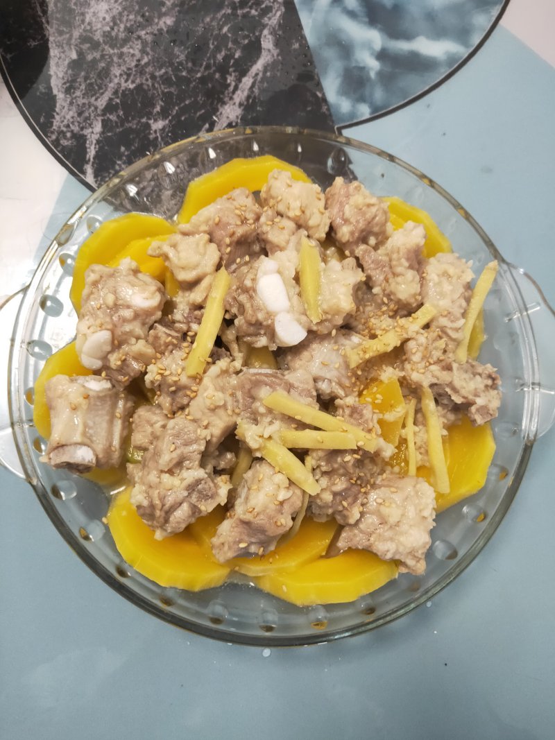 5:底下铺上南瓜,再上面铺上排骨,上锅蒸20分钟。