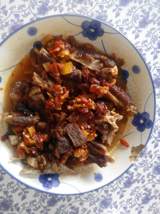 2:从煮锅捞出摆盘,再在腊排上浇上老干妈豆鼓和剁椒。