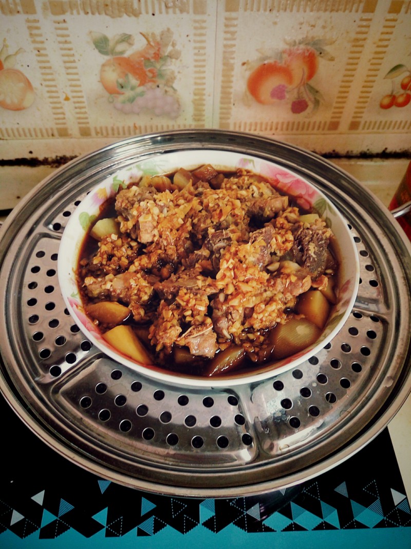 4:土豆切滚刀块,然后铺盘底,再把排骨均匀倒在土豆上,入锅蒸30至40分钟,至肉能用筷子戳过去就好