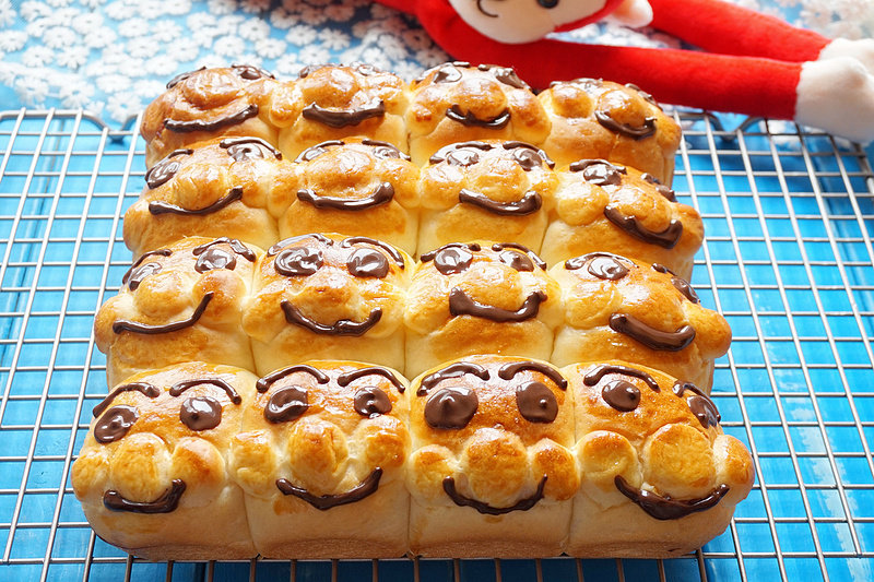 15:出炉放凉,巧克力融化以后装裱花袋里画上表情。面包超人挤挤排包就做好了。