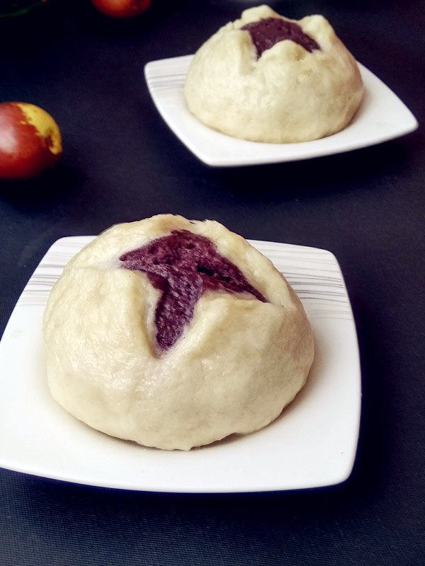 4:30分钟后…取一小白面团压扁擀皮像饺子皮大小就好、取一小紫薯面团包在里面、包完后用小刀在上面划个十字口(还要待醒发后)上锅蒸