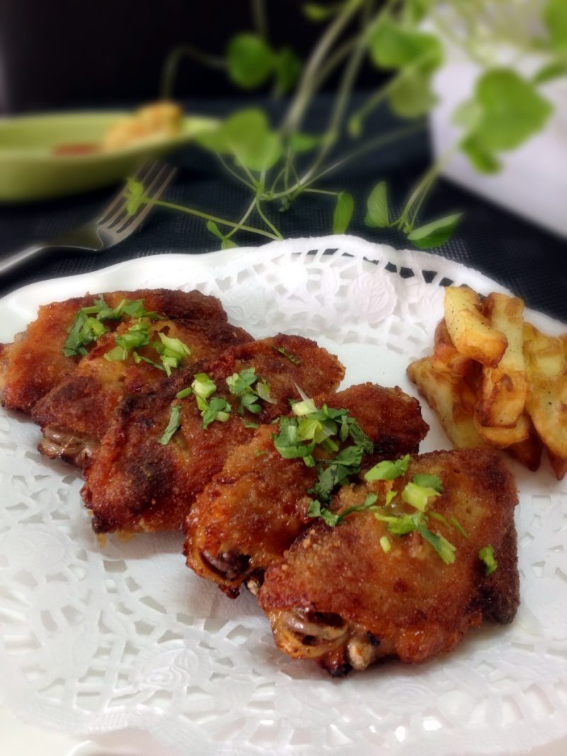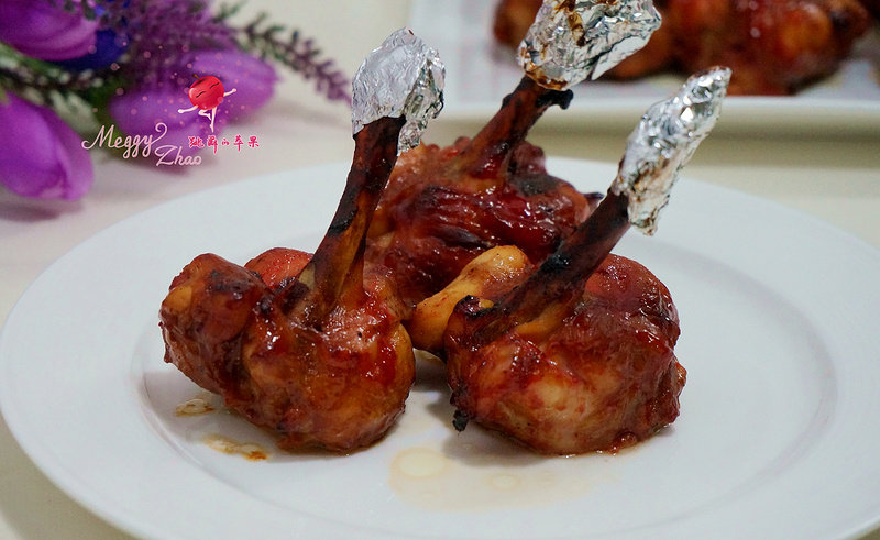 6:把腌制过的鸡腿放烤盘里(底下铺锡纸),把细的部份用锡纸包住,否则容易烤焦