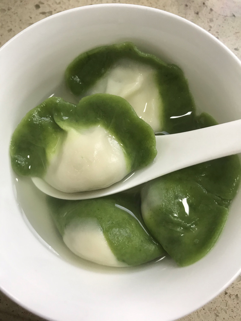 6:绿色的擀成面皮,把白色的包裹在里面。