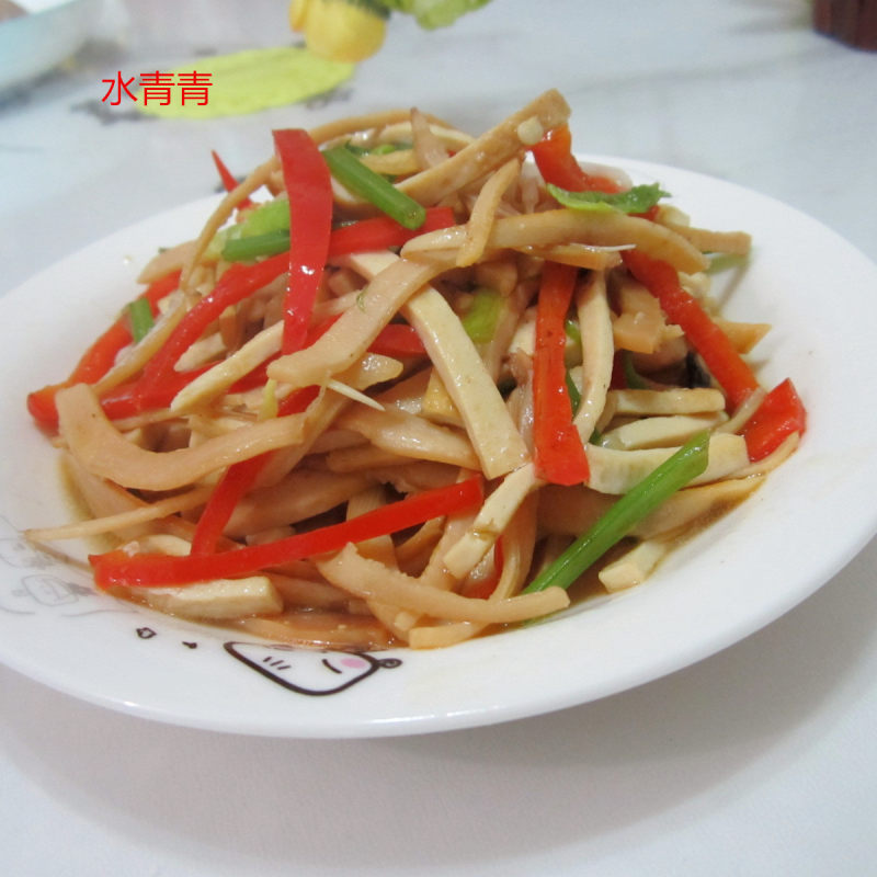 2:鱿鱼丝用清水泡软,泡去咸味清洗待用。