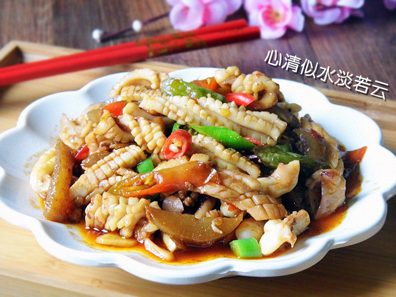 7:倒入鱿鱼,调入料酒翻炒。(料酒可以多一点)