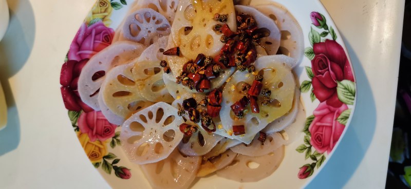 6:过好凉水的藕片装盘,放入香醋、少许生抽、适量盐、白糖拌匀,再放上蒜泥,浇上爆香的辣椒、麻椒和热油。一盘超下饭,酸酸甜甜微辣微麻的炝藕就做好了。