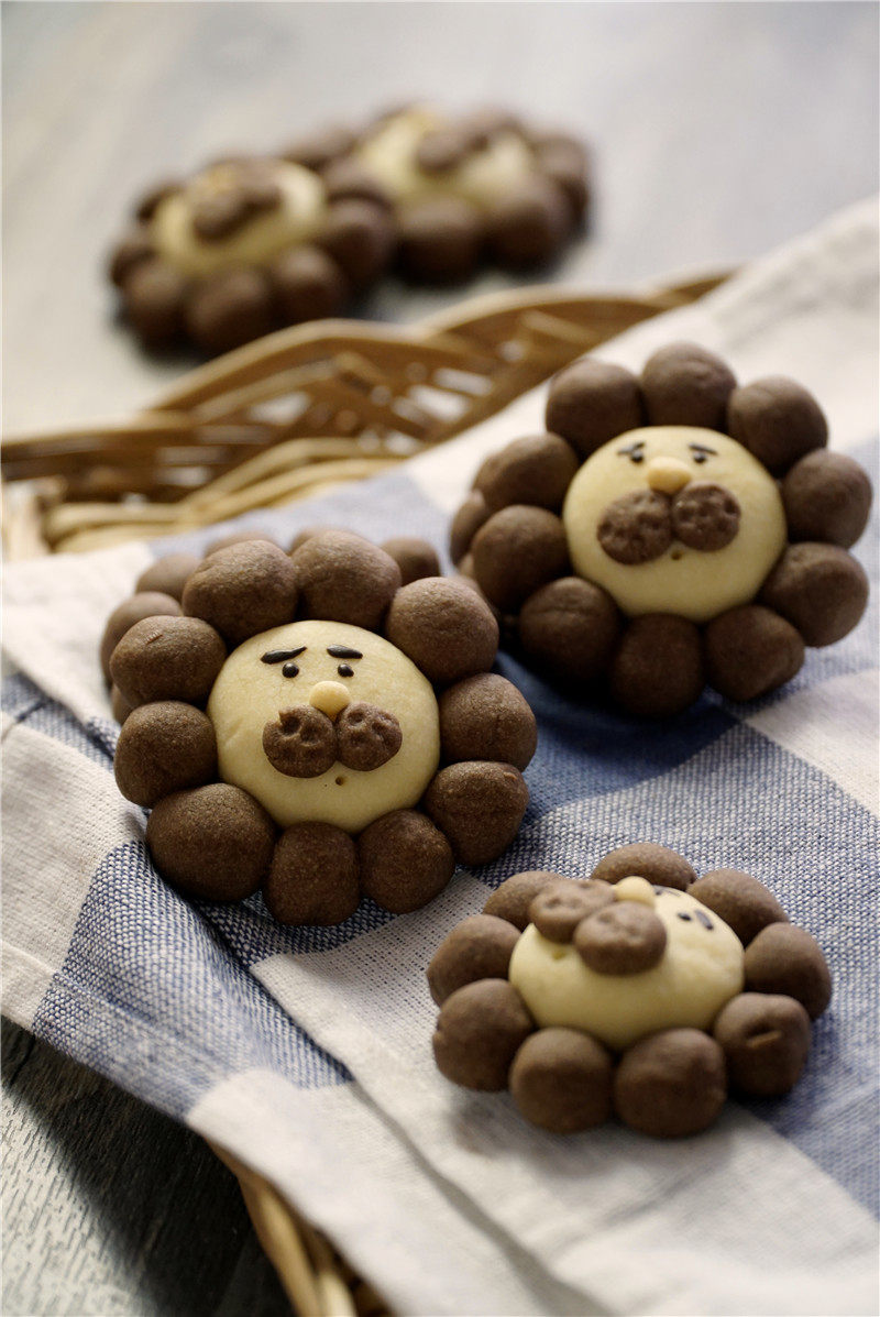 8:150度,15分钟,不要上色太深,会不好看。烤好之后,用黑巧克力画出狮子的眉毛和眼睛就好了