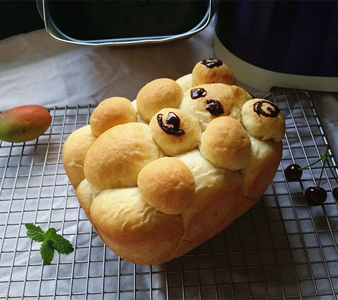 1、这款面包的操作方和其它面包一样简单不复杂2、关键是各个小球的摆放位置非常重要,摆放不对自然就没有熊宝宝的造型了3、画五官时一定不能偷懒用巧克力酱替代融化的巧克力液,一开始我就是想偷懒用好时巧克力酱画,因为酱太稀了刚画上去就流淌下来;没办法赶紧用厨房用纸吸掉,又去溶化黑巧克力重新画的,所以也导致画的很难看4、烘烤时间和烧色,依各家面包机情况而定