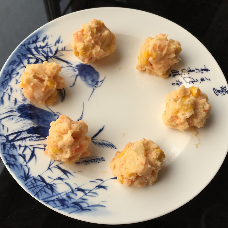 玉米粒1袋;牛奶1袋;土豆2个;鲜虾仁10只;香甜沙拉酱1小袋;