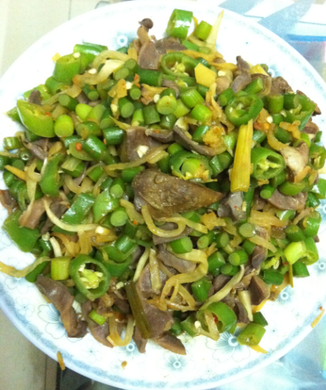 4:蒜苔和湖南椒炒至断青之后,马上加入鸡杂,猛火快炒。