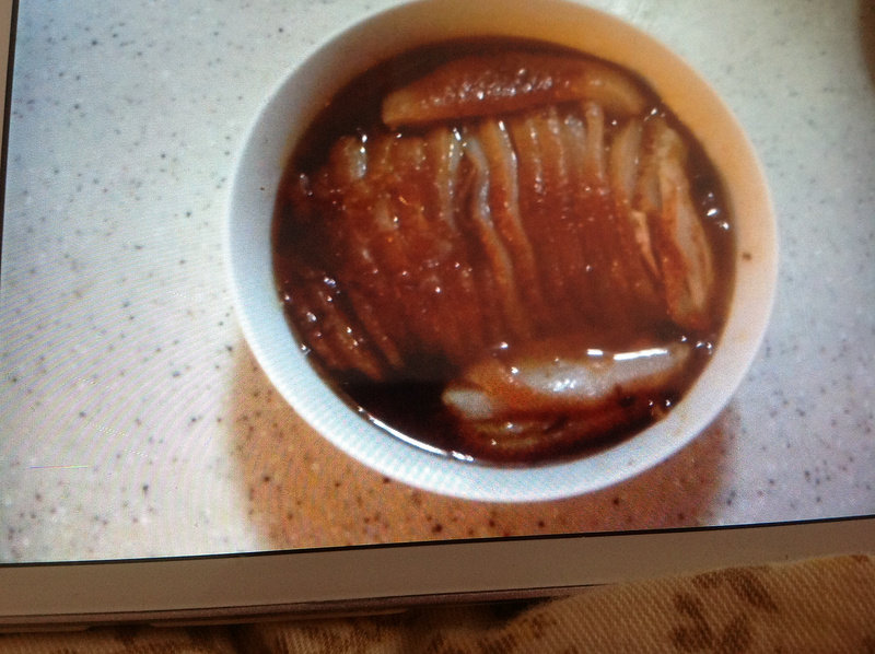 5:把五花肉切成8mm左右厚的片,肉皮朝下,均匀的摆放在碗中。
