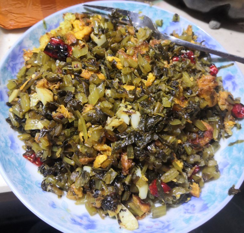 此菜肉皮很香,所以一定要把肉皮炸成金黄色;腊腌菜带酸味,把它切细了,才能让它的酸味彻底释放出来。个人认为这道菜蒸的时间越长越好吃,时间允许的话,蒸两个小时是最好的,但个人的口味不一样,请大家自己斟酌吧!
