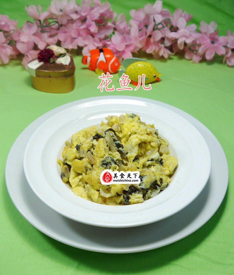 3:接着,将切好的腌白菜合入鸡蛋中。