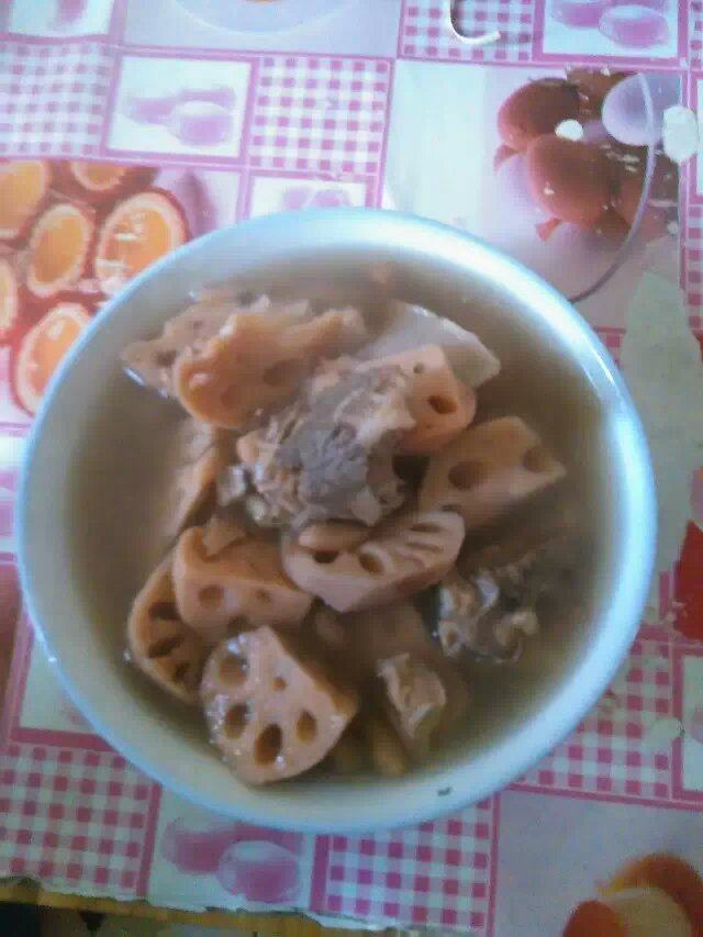 4:待龙骨煮至7成熟时,放入切块的莲藕,将龙骨煮熟、莲藕软糯,放入食盐、鸡精调味,即可。
