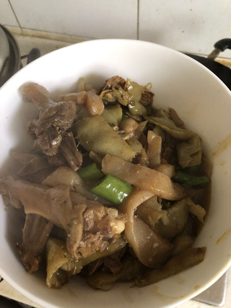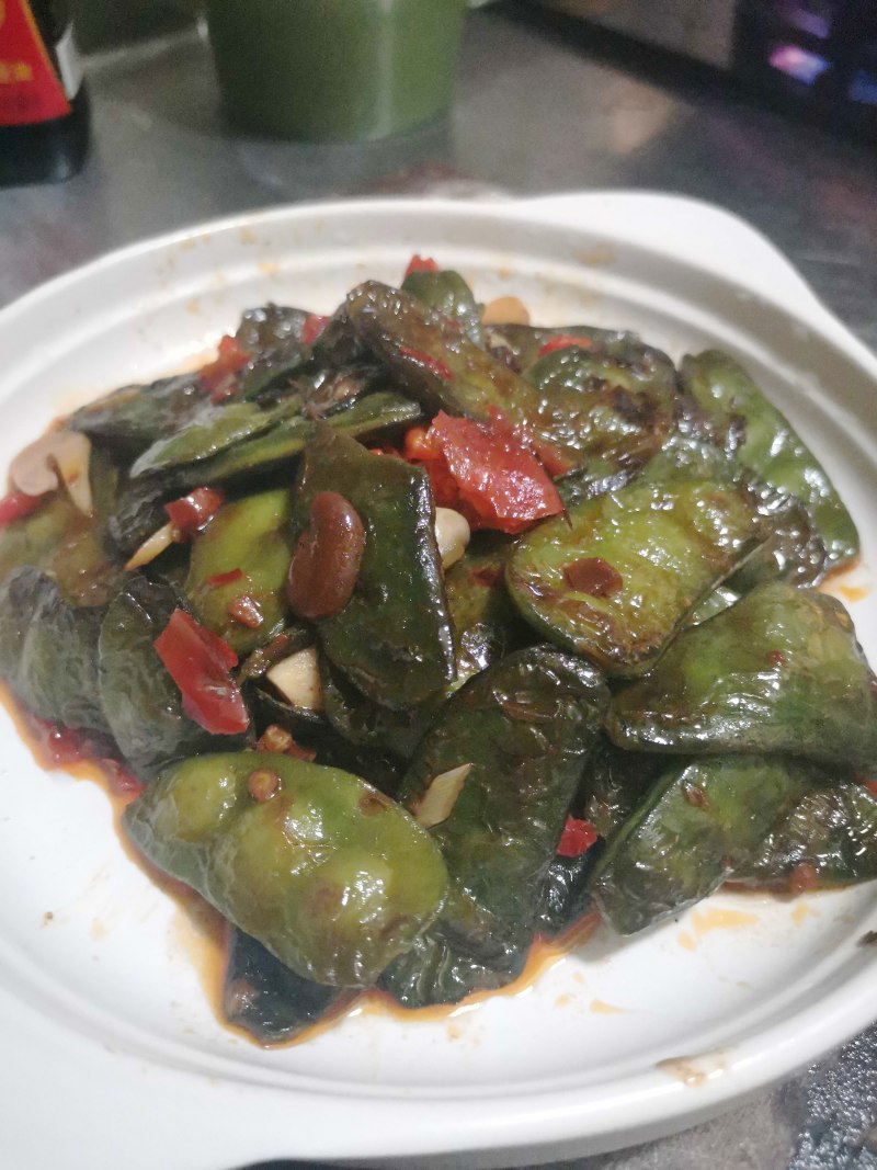 7:放入扁豆和青椒段翻炒,再烧10分钟。