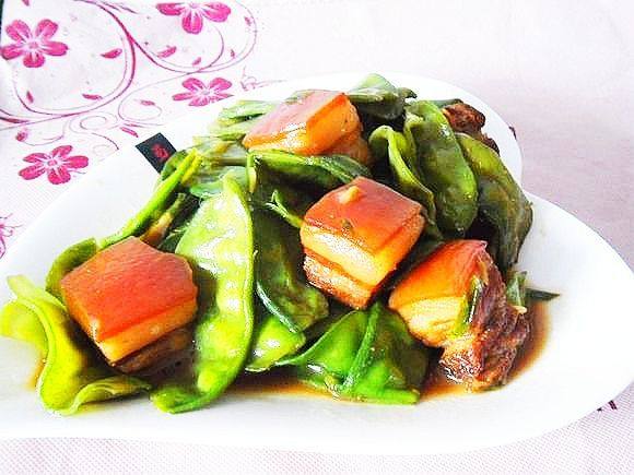 因为红烧肉是熟的,所以把扁豆烧至熟透就可以了。