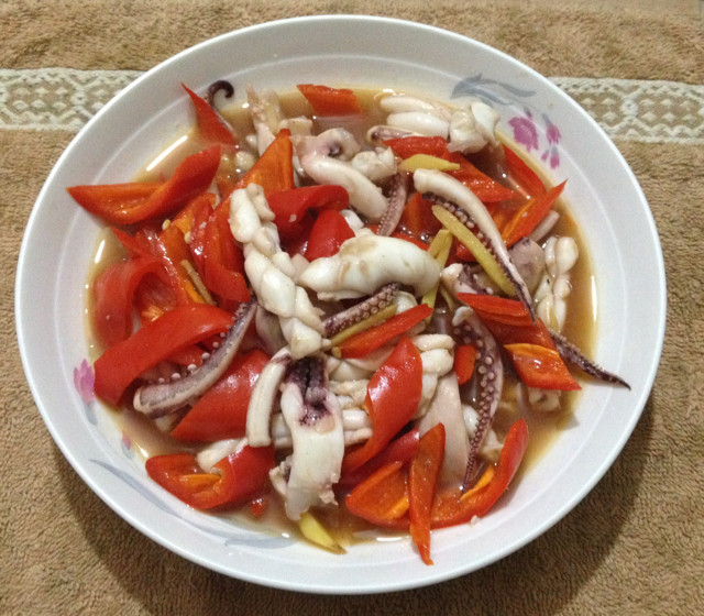 3:少油,先把辣椒煸炒一下(可煸炒可不煸炒)装盘,油比煸辣椒多点,放入姜蒜花椒炒出香味,放鱿鱼辣椒十三香盐