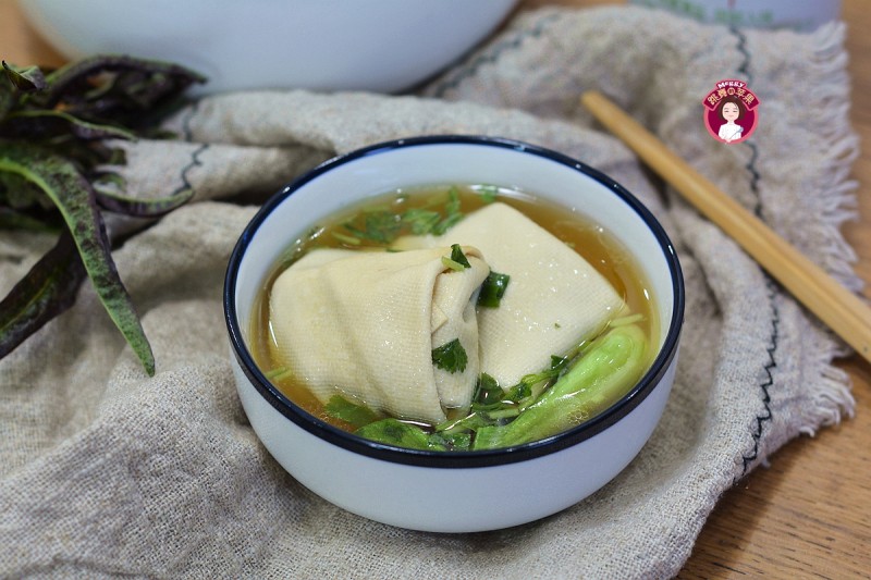 13:炖的时间可长可短,我用了1.5小时,千张包全部都浮在了水面,将油菜芯和香葱段、小葱末撒在汤里,盐可根据口味添加,不加其实更清淡,也更符合现在所倡导的低盐饮食。