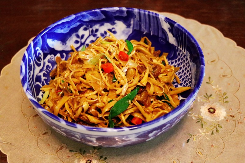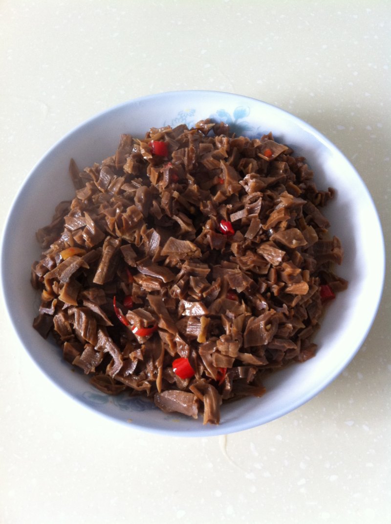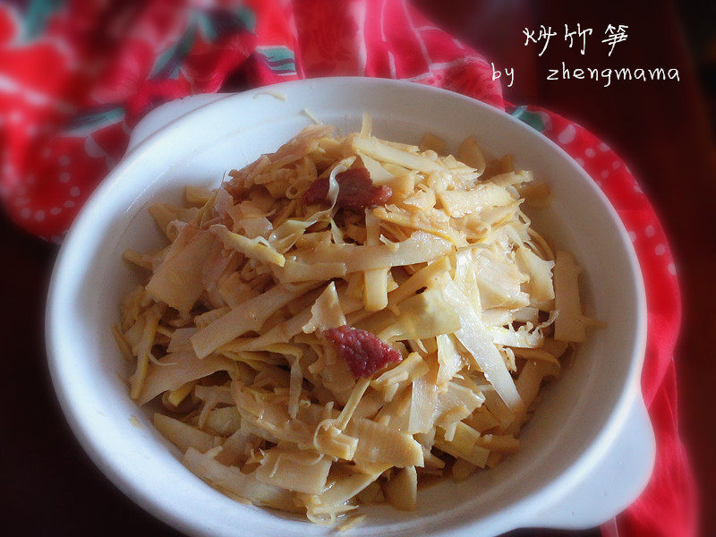 3:另锅爆炒笋丝、咸菜丝约三分钟,放入尖椒丝、盐、鸡精。