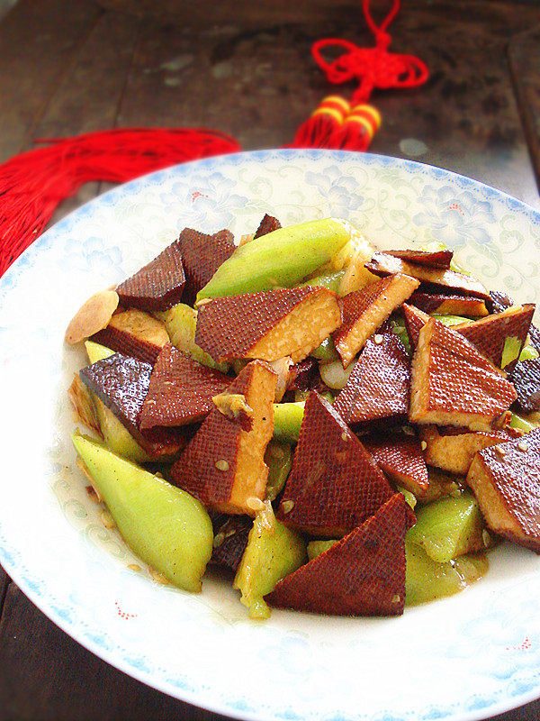 9:接着,合入焯好的雷笋和切好的香干翻炒翻炒。