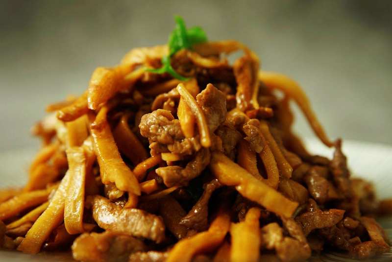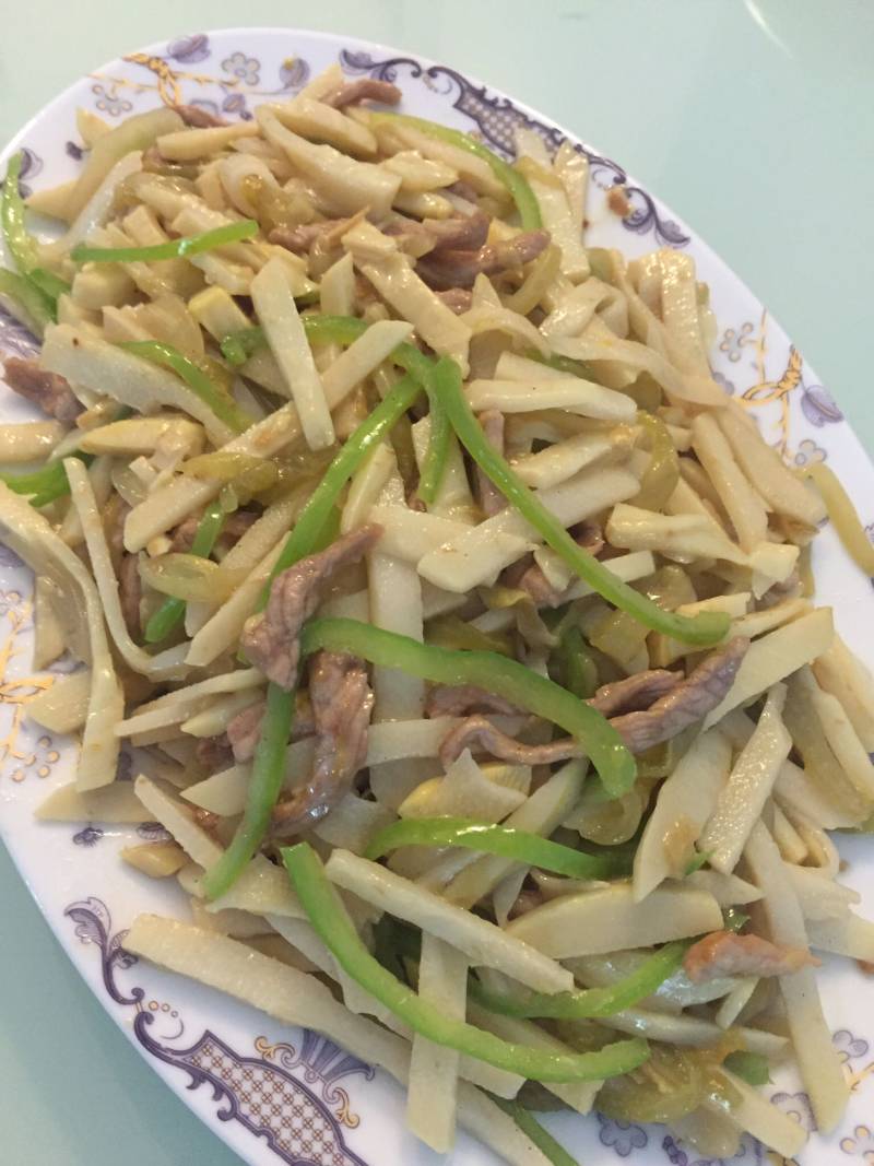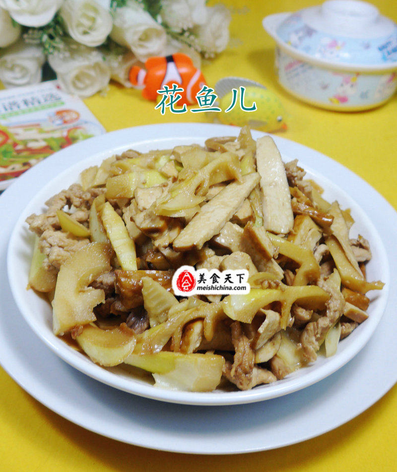 2:瘦肉切条,加生抽、油、生粉腌制十分钟。热锅炒至八成熟装盘待用。