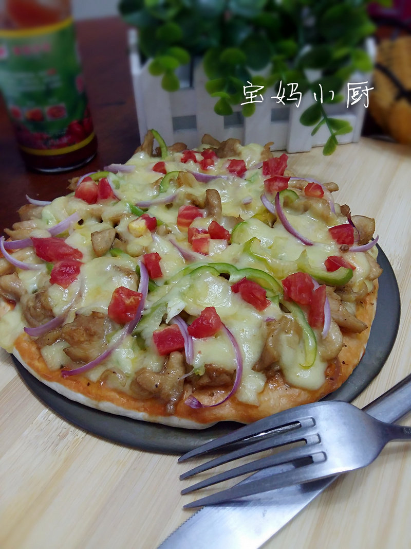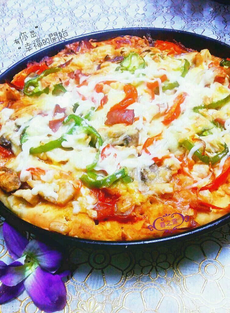 鸡肉适量;披萨酱适量;蔬菜粒适量;马苏里拉适量;甜椒2个;香肠一根;蘑菇适量;