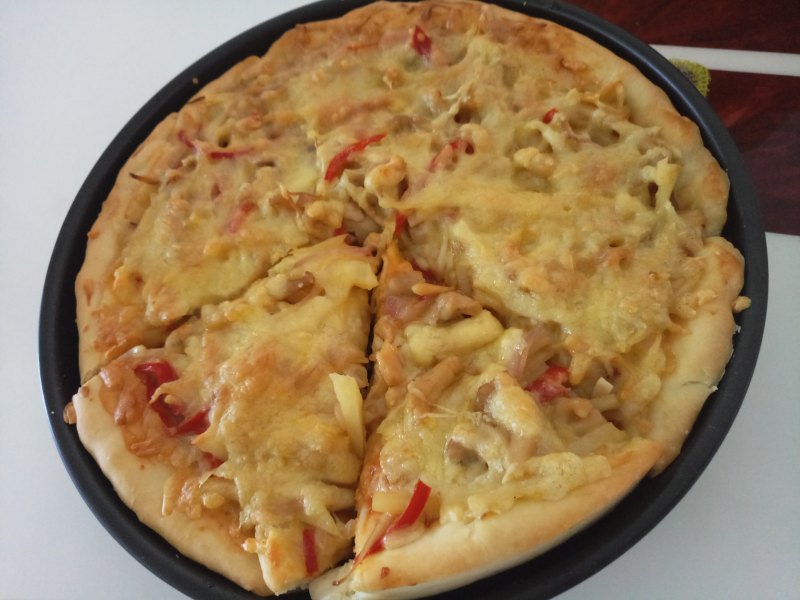 中筋面粉100g;色拉油10mL;水50g;糖10g;酵母粉1g;盐1g;披萨酱适量;烤肉的鸡腿肉1个;红甜椒适量;马苏里拉芝士适量;
