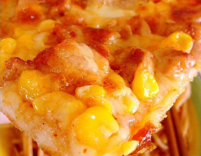 4:面上抹上酱撒点马苏里拉然后把肉和玉米粒撒上去再铺一层芝士烤吧…
