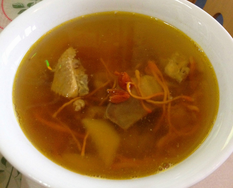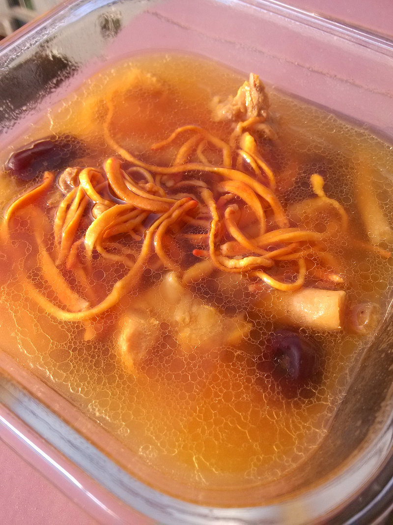 10:水开之后煮大约四十分钟,可以看到,本来米白色的肌肉已经被虫草花染成了橙黄色。这个时候可以尝尝味道。要是感觉汤的味道不够就再加点盐,我补了一匙盐,依个人口味定。之后再煮五分钟左右即成。
