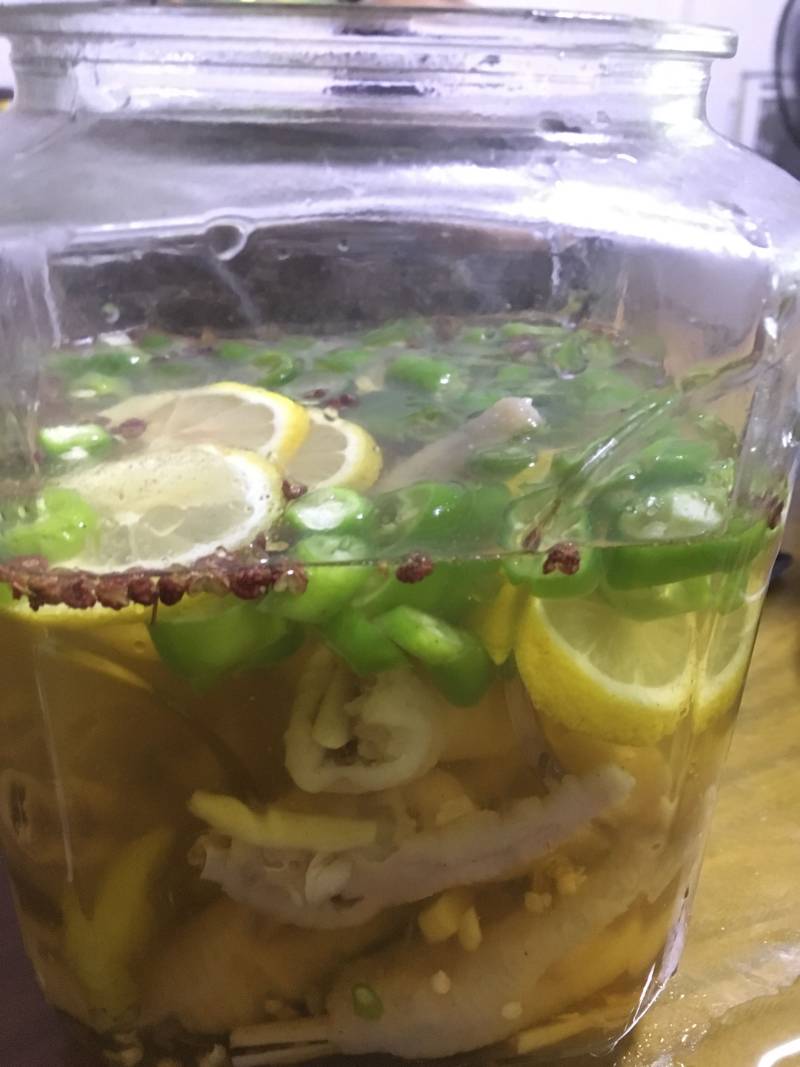 5:找个擦干净水份的玻璃瓶或是陶瓷瓶,瓶底放点辣椒柠檬,加鸭脚,中间再放柠檬辣椒放鸭脚,最后放辣椒柠檬大葱封顶。