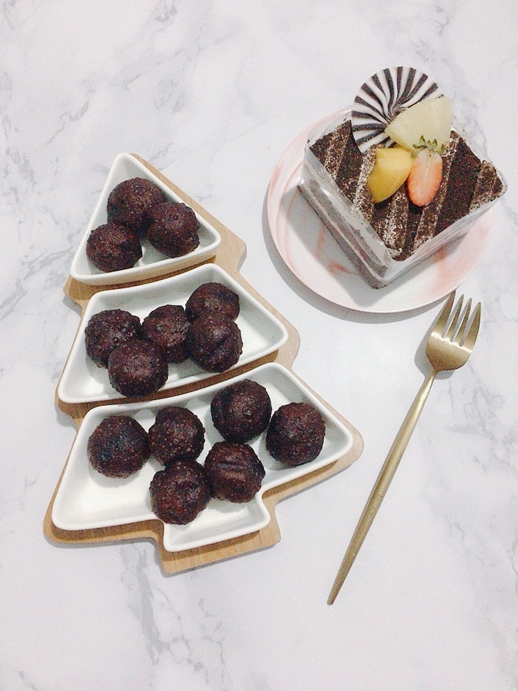 5:带上一次性手套将紫薯泥取一小剂搓圆,然后裹上芝麻