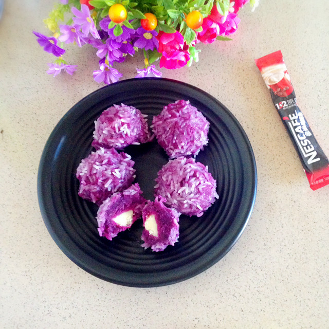 紫薯泥中的糯米粉根据紫薯的含水量添加,能把紫薯揉成团即可,不要多。