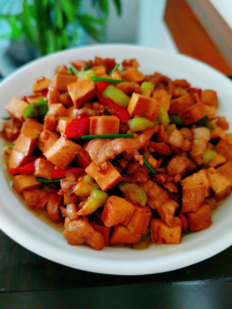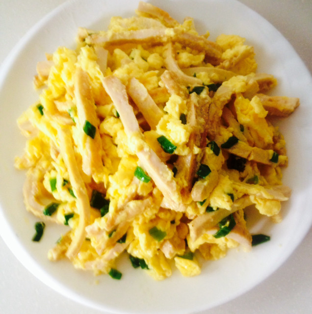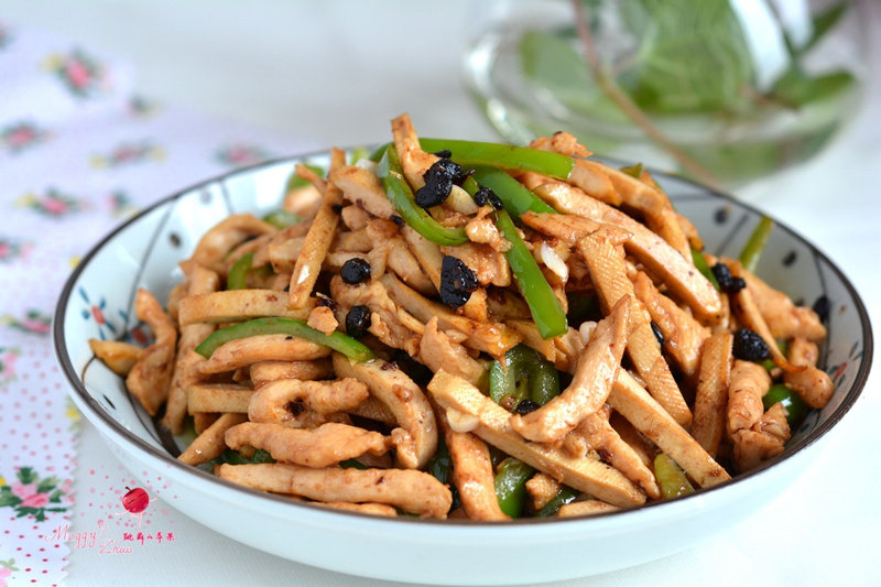 鸡肉酥冻的时候,切丝均匀,要顺着肉丝的方向切,炒完不碎不断;先炒青椒、豆腐干,提前码味儿;凉油倒入鸡肉丝,快速划散,使肉丝均匀沾上油,这样炒时不粘连,不糊锅;没有豆豉就放点蚝油吧,那味道也是很鲜的。