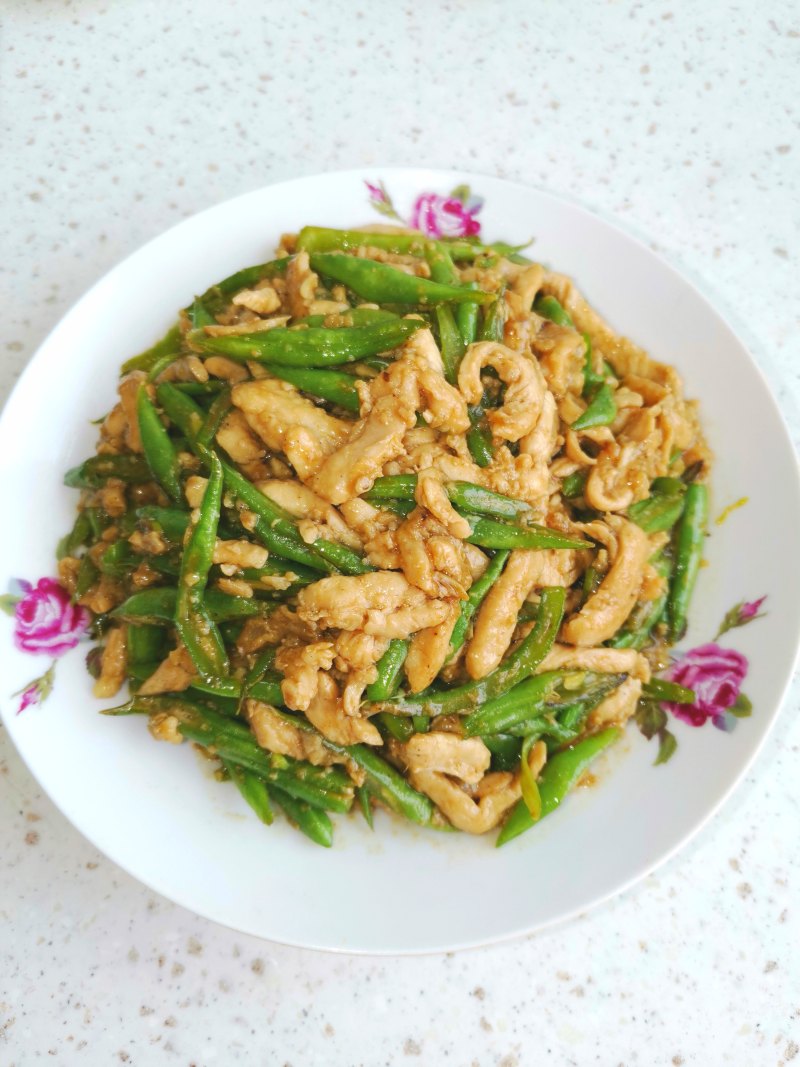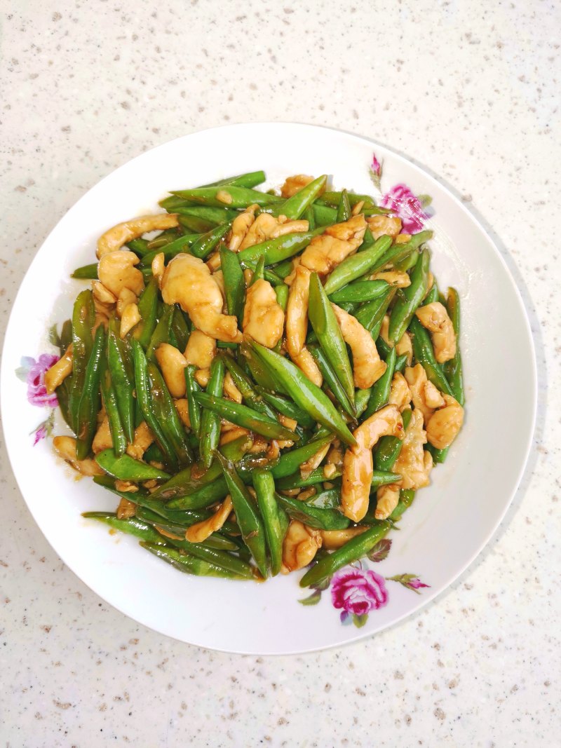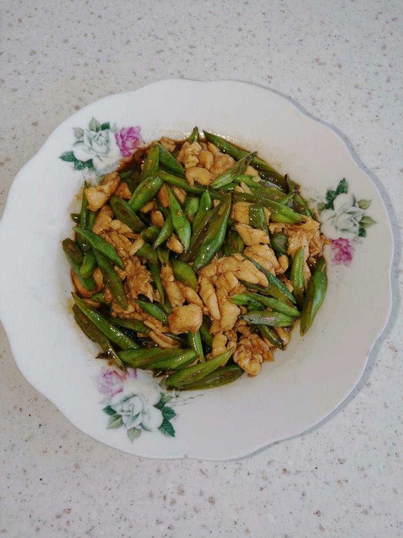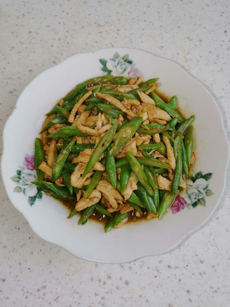1:豆角洗净去除筋和头尾,切段,鸡胸切丝放淀粉,盐,料酒,腌制15分钟。