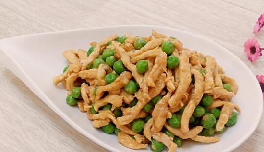 7:待鸡丝炒至金黄色,放入豌豆和盐翻炒均匀即可。