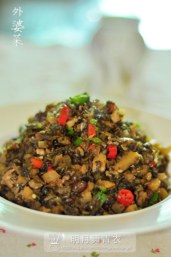 5:当青菜断生,倒入外婆菜,加少许盐,淋入少许水和蚝油翻炒均匀即可。