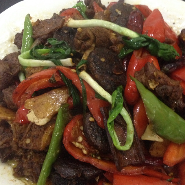 7:最后再放入青红尖椒,翻炒,至辣椒圈有点变软,调味即可。