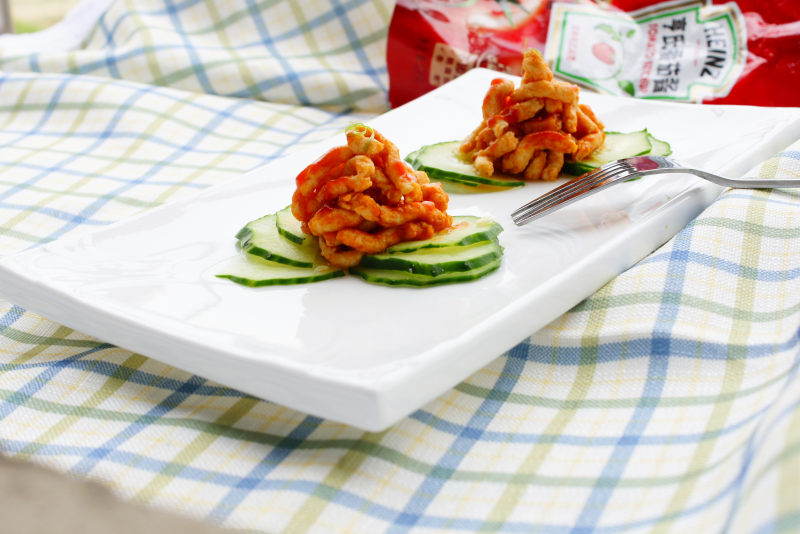 1:黄瓜削皮后打竖改刀成四瓣,去襄再斜刀切成片,放在大碗里;