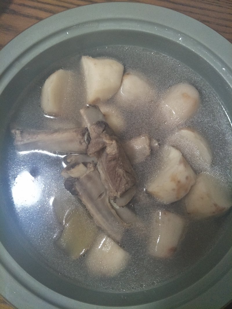 5:筒骨煮约1.5小时后放入芋艿,略煮几分钟后,等芋艿熟软后加盐调味,出锅。