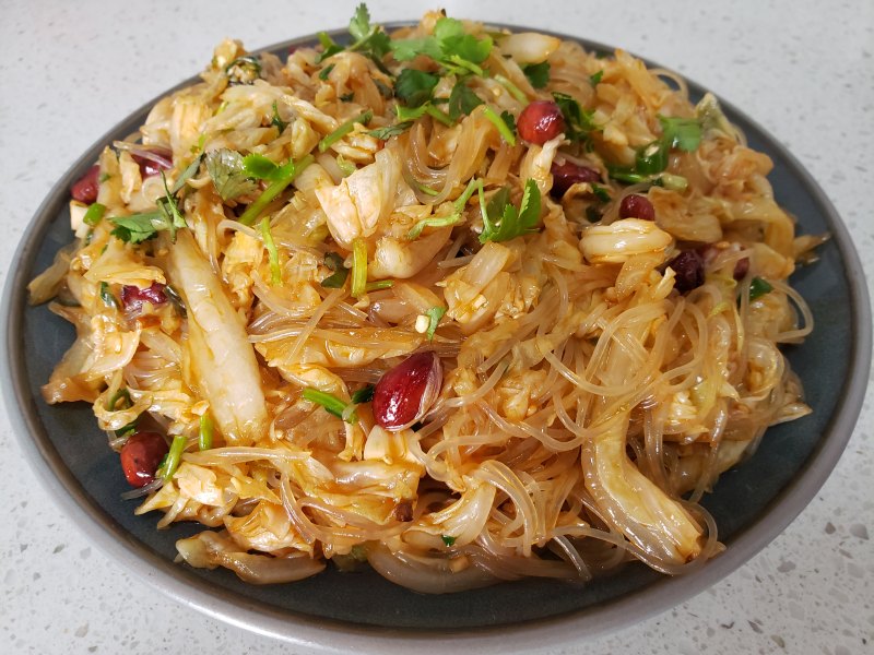6:锅中倒入亚马逊橄榄油,放入辣椒炸到变成枣红色倒到白菜粉丝上,放上香菜段即可!