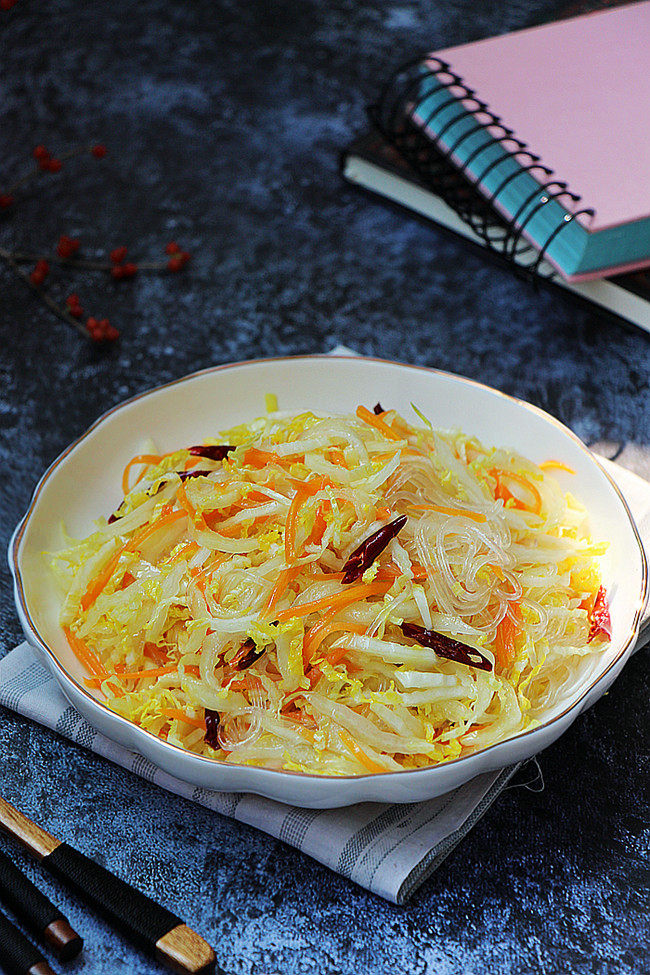 6:粉丝和胡萝卜丝捞出空按水份和白菜丝、干辣椒丝放入容器中