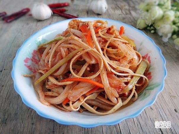 4:海带丝温水泡半个小时,淖一下,过凉水捞出,沥干水分。