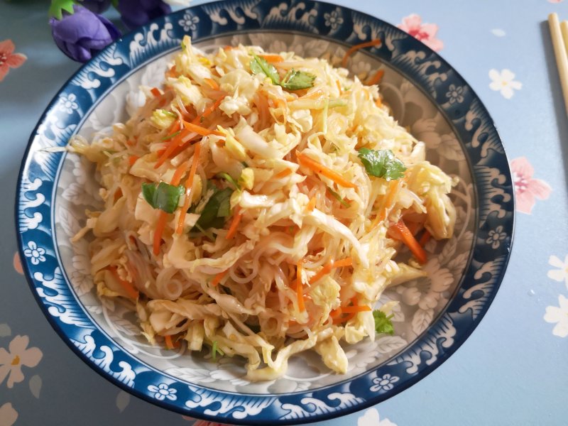 2:白菜切细细的丝,胡萝卜切丝,蒜切碎,粉丝先用凉水浸泡再用开水煮熟,香菜切小段。
