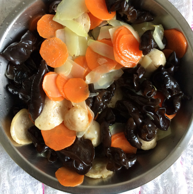 1:把木耳放到冷水浸泡洗干净,胡萝卜和菜梗切片,肉丸也切片!